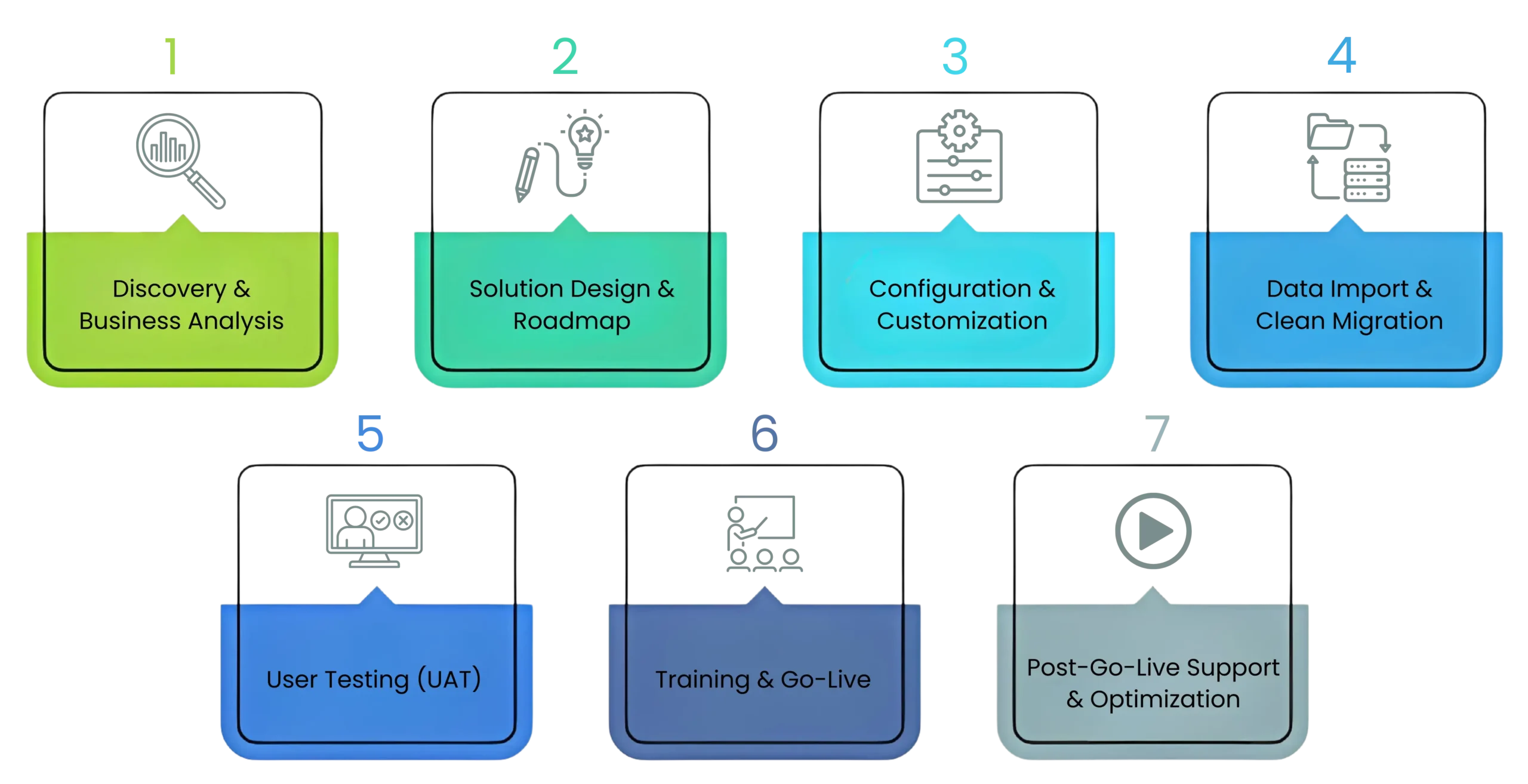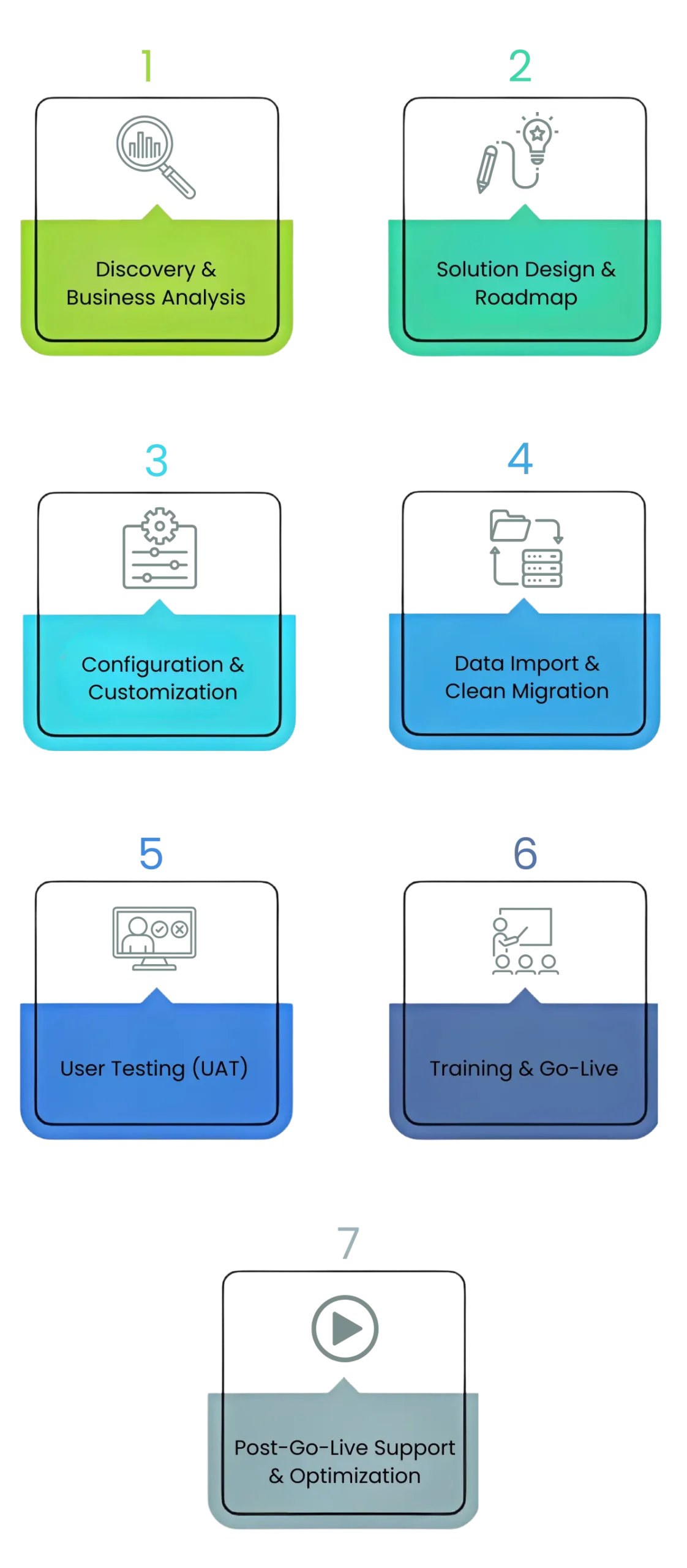 I don’t just implement software — I follow a structured process to deeply align with your business needs, configure Odoo to fit your workflows, and ensure smooth adoption across teams. Whether you're transitioning from another system or starting fresh, this process guarantees a robust and future-ready Odoo environment.